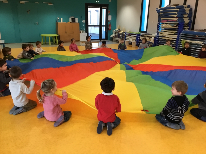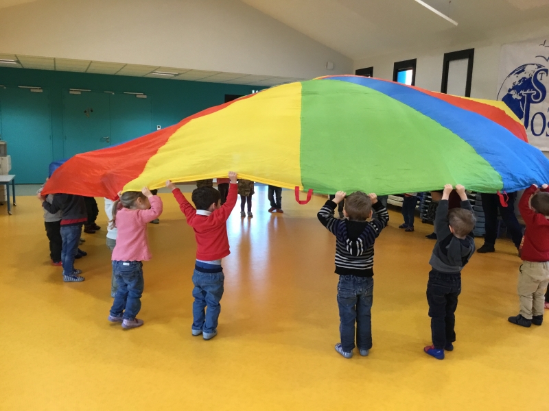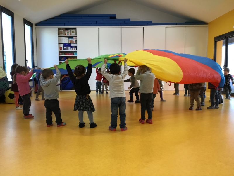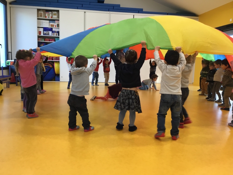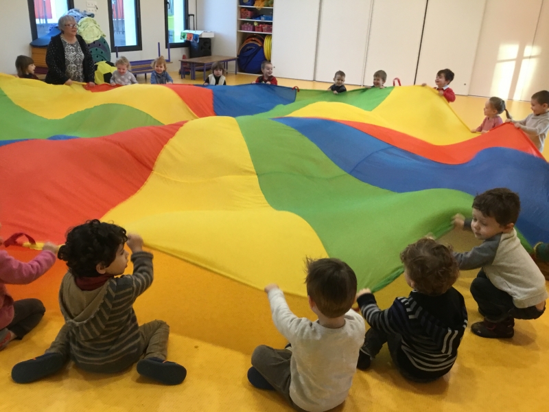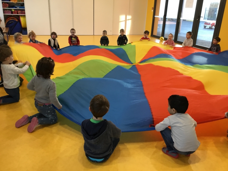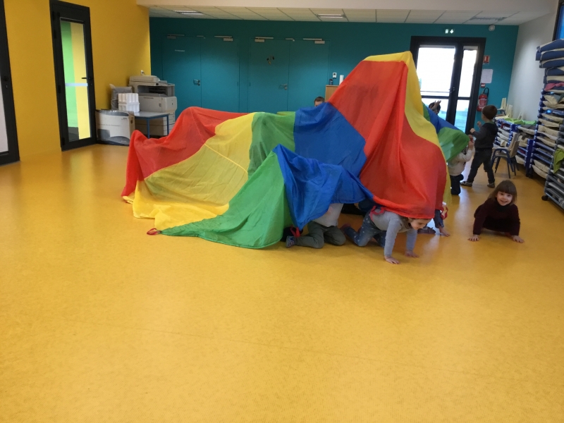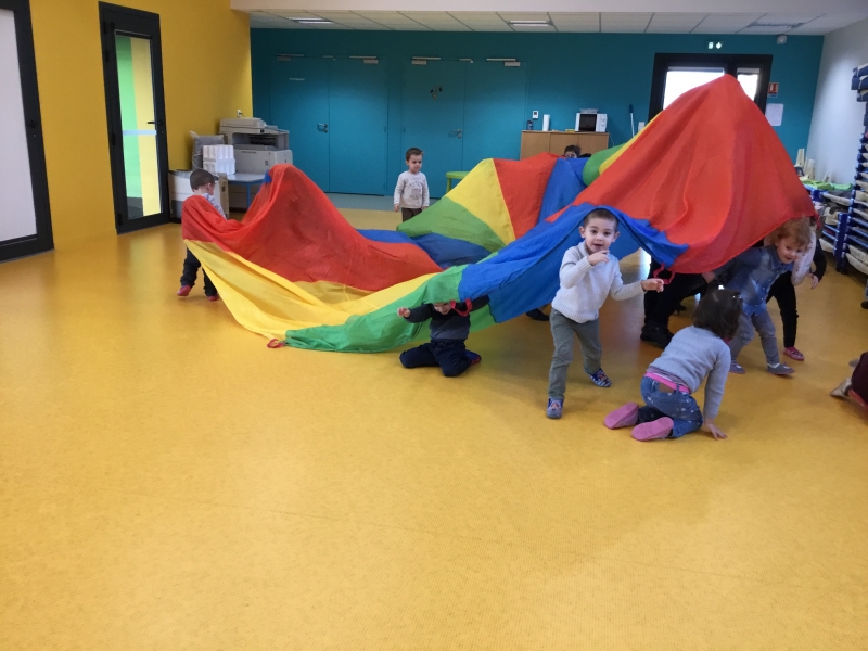 Les Petits font du parachute………. dans la salle de motricité. C’est drôle de faire des vagues, de se cacher, de passer en-dessous et surtout de disparaître !!!!