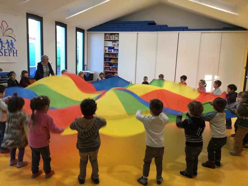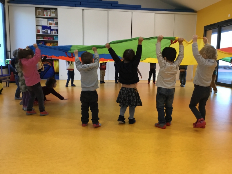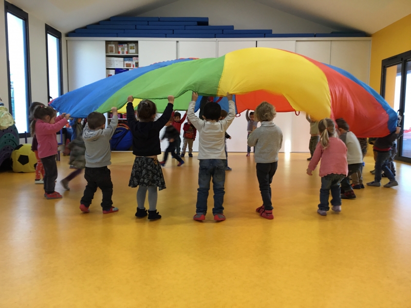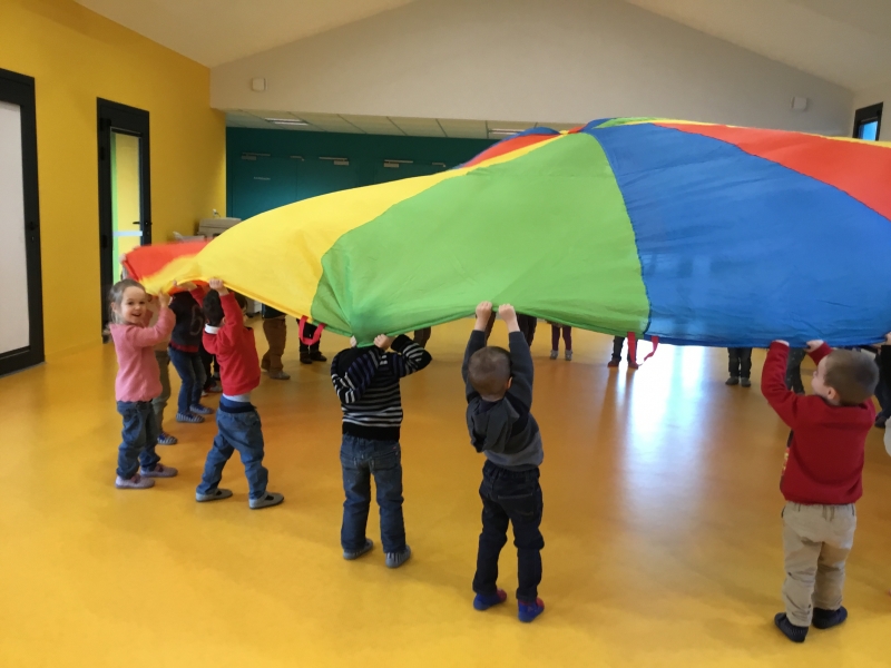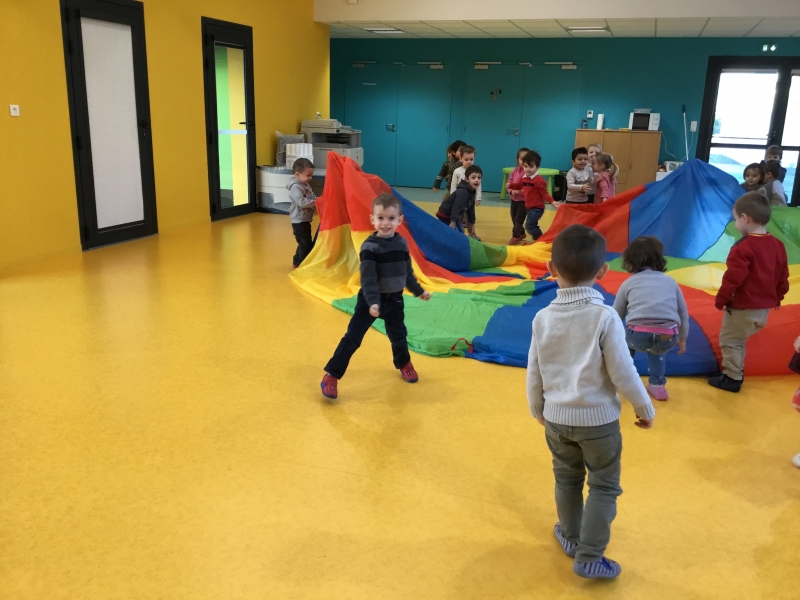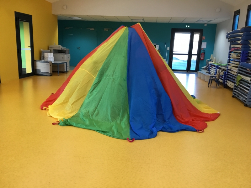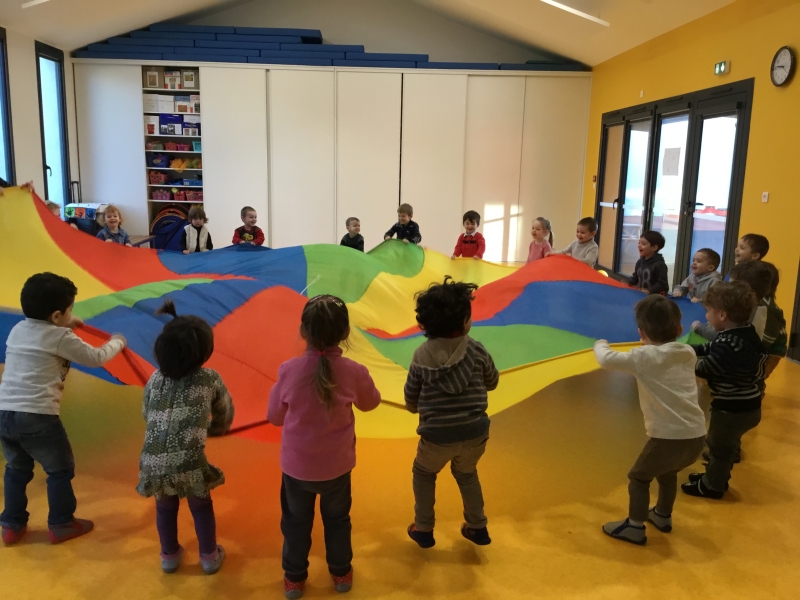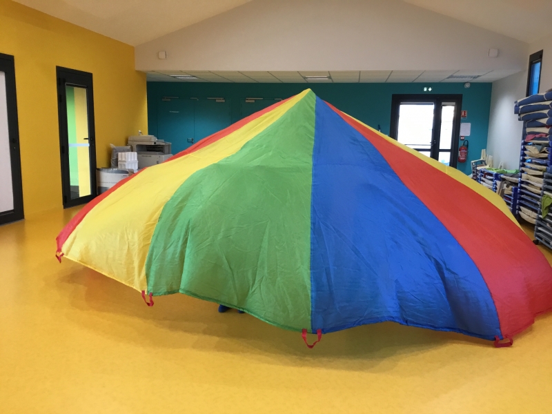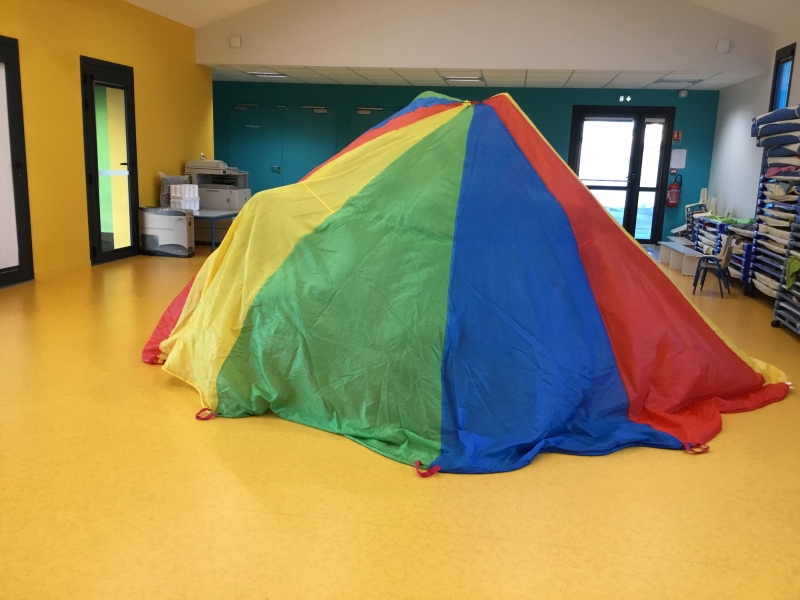 Les Petits font du parachute………. dans la salle de motricité. C’est drôle de faire des vagues, de se cacher, de passer en-dessous et surtout de disparaître !!!!