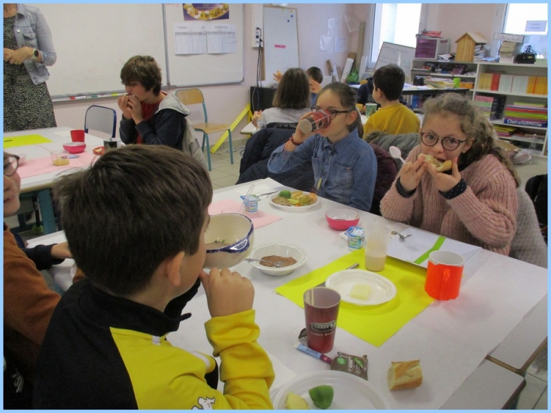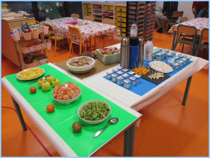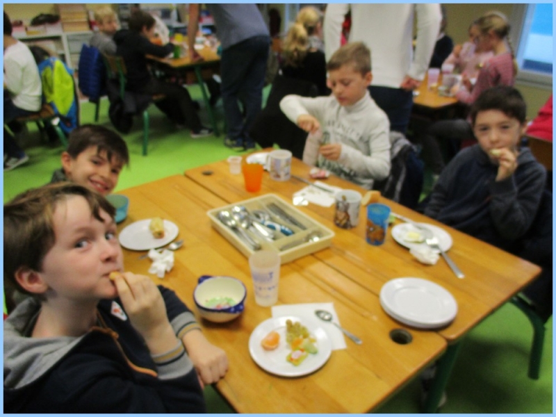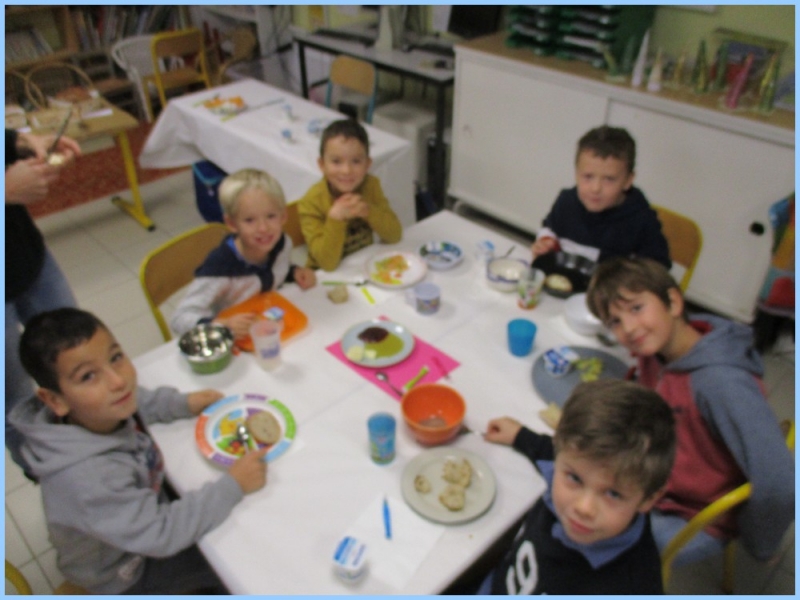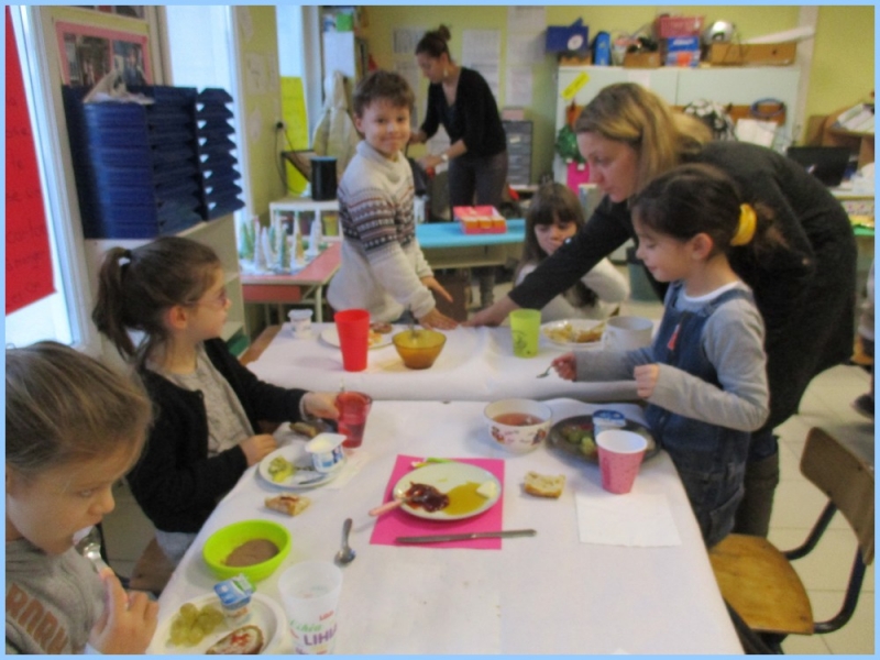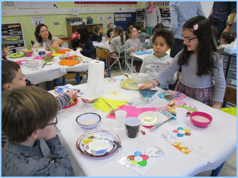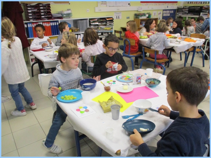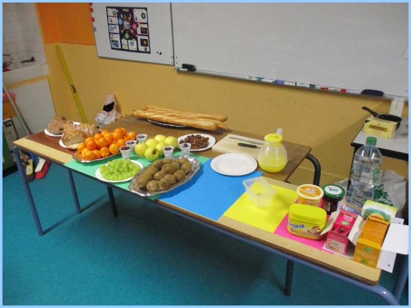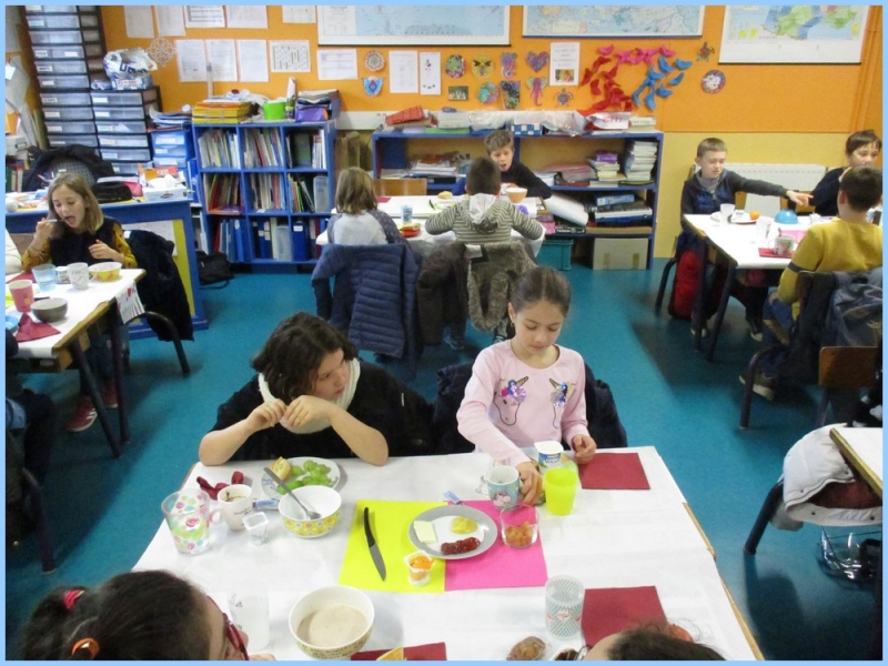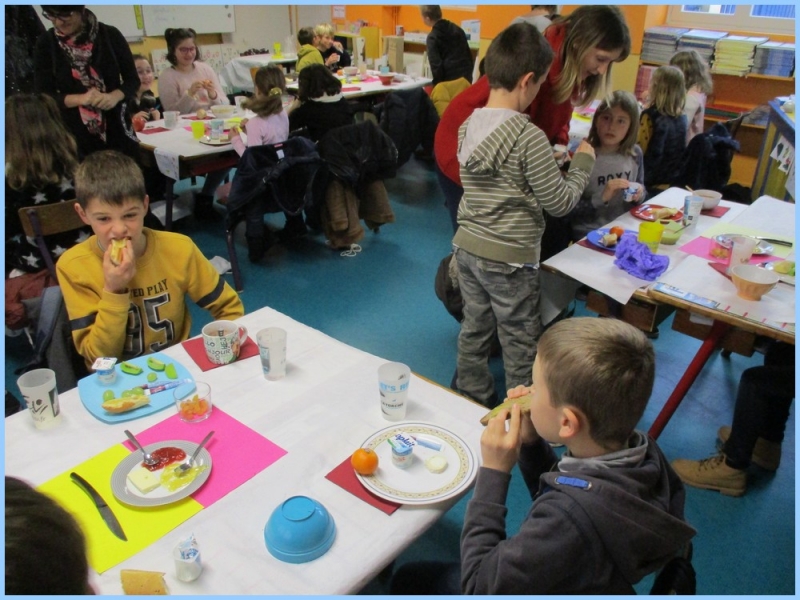 Ce petit déjeuner commun a permis de concrétiser leurs apprentissages sur l’équilibre du premier repas de la journée. Les enfants ont été placés en situation de choix. En effet, un buffet présentant un grand nombre d’aliments des 6 groupes alimentaires nécessaires (produits laitiers, produits céréaliers, fruits, confiture ou miel, beurre, boissons chaudes ou froides) a été préparé dans chacune des 10 classes.