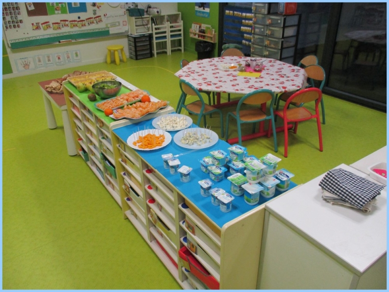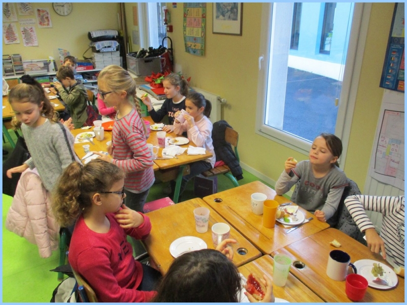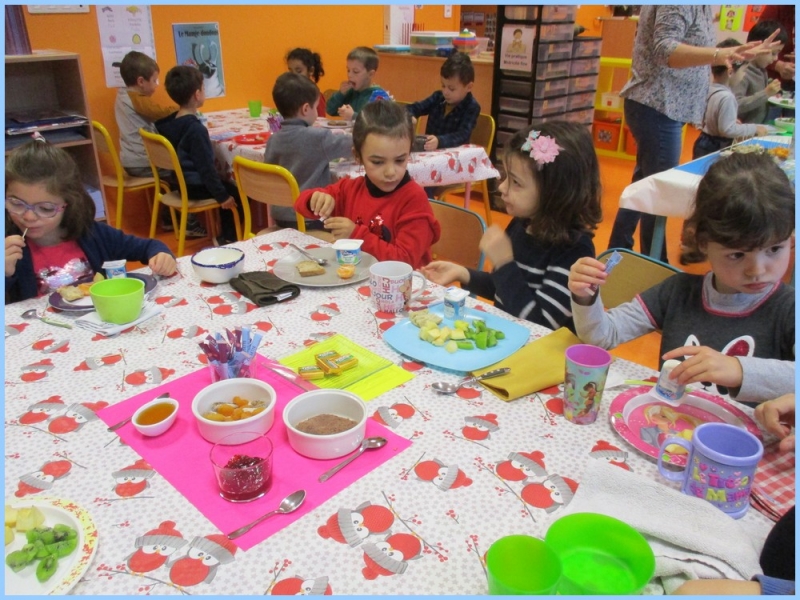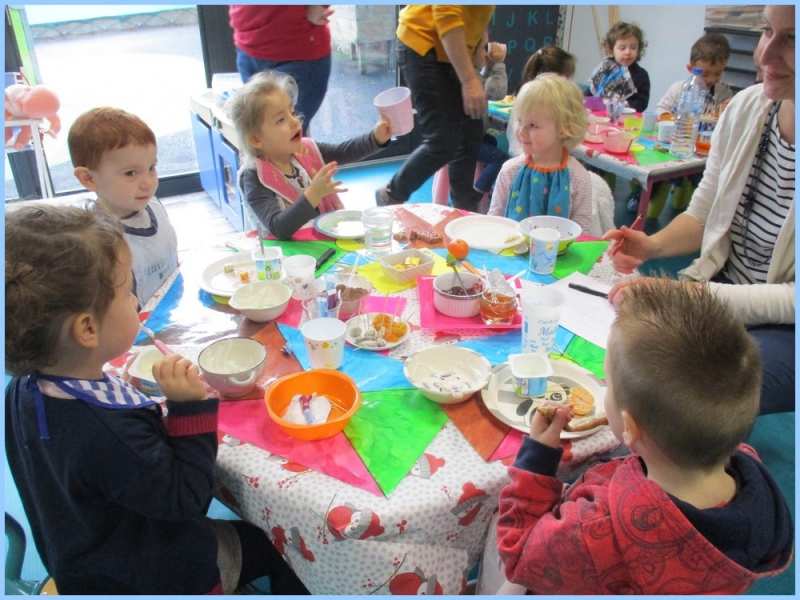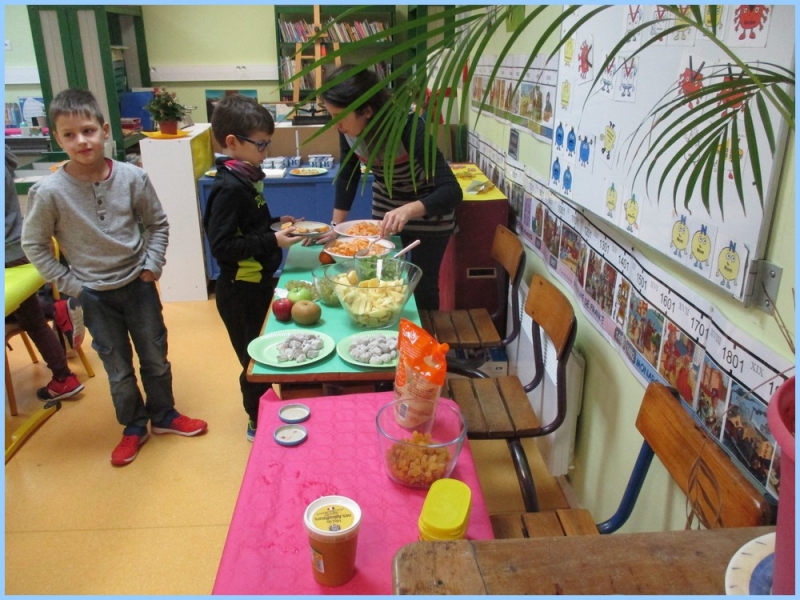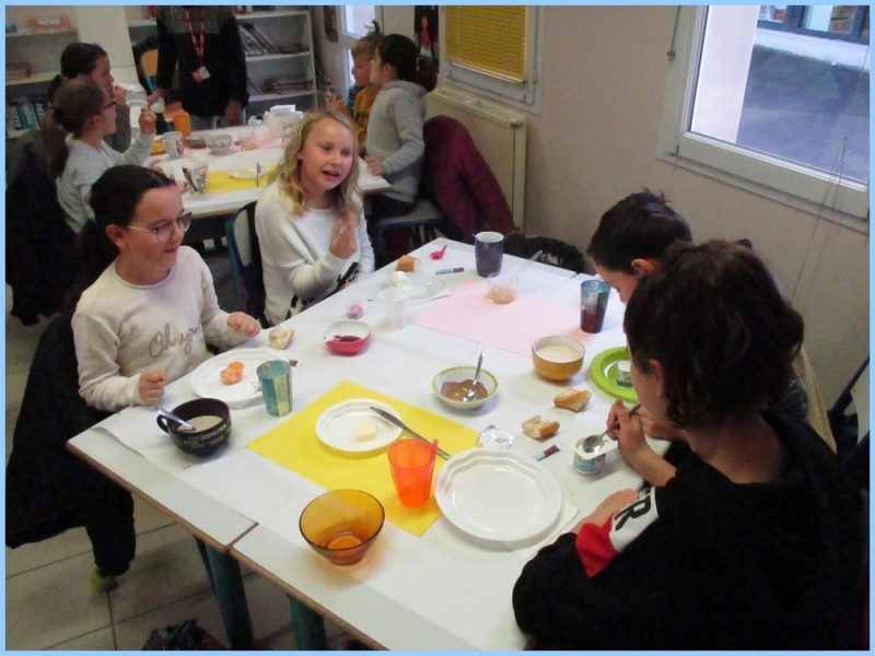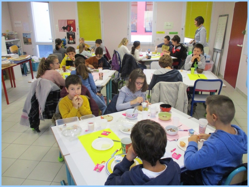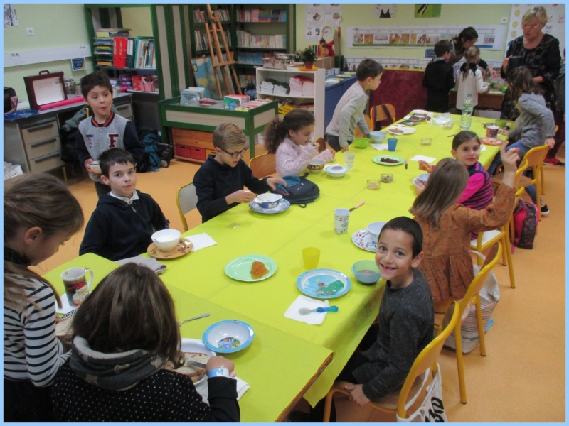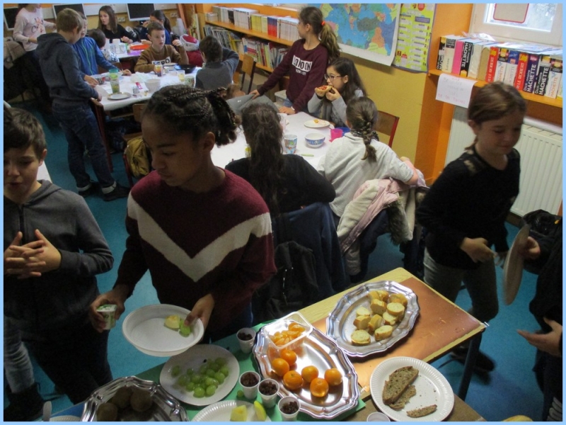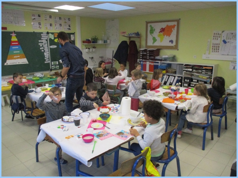 Ce petit déjeuner commun a permis de concrétiser leurs apprentissages sur l’équilibre du premier repas de la journée. Les enfants ont été placés en situation de choix. En effet, un buffet présentant un grand nombre d’aliments des 6 groupes alimentaires nécessaires (produits laitiers, produits céréaliers, fruits, confiture ou miel, beurre, boissons chaudes ou froides) a été préparé dans chacune des 10 classes.