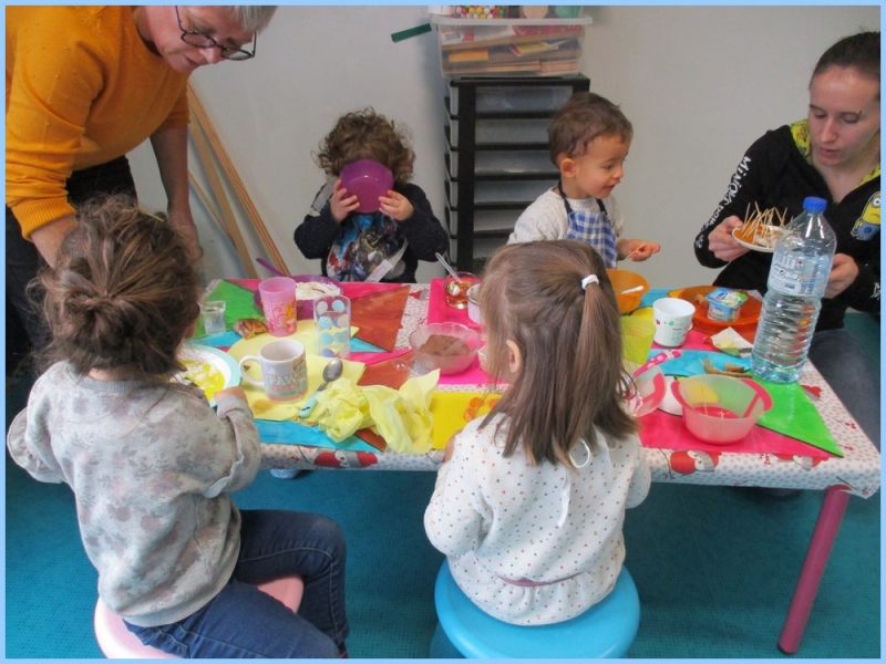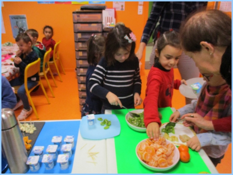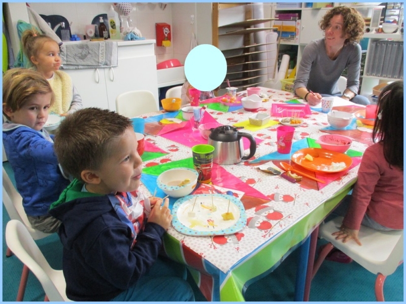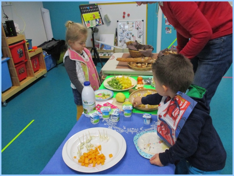 Chacun avait un défi : manger un aliment de chaque groupe et goûter un aliment inconnu. Les parents bénévoles aidant à ce petit déjeuner ont été parfois surpris de voir les enfants apprécier tel ou tel fromage ou encore de l’ananas !