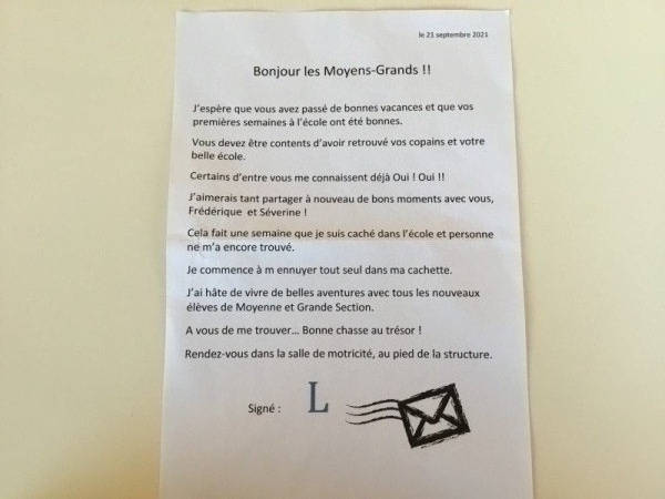 Nous l’avons ouverte et nous avons trouvé à l’intérieur une lettre signée de “L” qui souhaitait vivre de belles aventures avec nous et nous demandait de le trouver dans l’école.